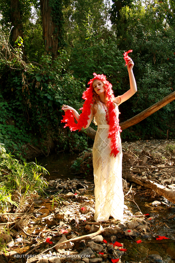 We styled the shoot with a long lace dress from Free People, underneath we put a gold sequin slip for more glitter. Topped it off with a vintage fake fur cape then added lots of rings and necklaces. We curled Camilla's hair into long waves and of course applied deep red lipstick. For shoes, (although you don't see them) we used Jeffrey Campbell's black tick booties, that brought the look back to a current feel.